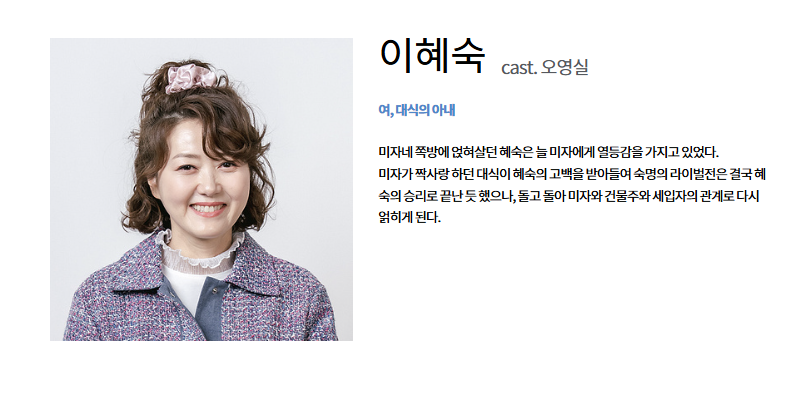 - 소개: 이혜숙은 김대식의 아내로, 과거 이미자네 쪽방에 얹혀살며 이미자에게 열등감을 가지고 있었습니다. 이미자가 짝사랑하던 김대식과 결혼하며 숙명의 라이벌전을 승리로 이끌었으나, 현재는 건물주와 세입자의 관계로 다시 얽히며 갈등을 이어갑니다.