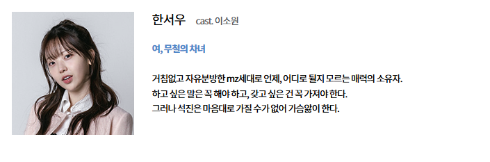 - 소개: 한서우는 한무철의 차녀로, 거침없고 자유분방한 MZ세대입니다. 하고 싶은 말과 갖고 싶은 것을 꼭 이루어야 하는 성격을 가졌지만, 김석진을 마음대로 가질 수 없어 가슴앓이를 합니다.