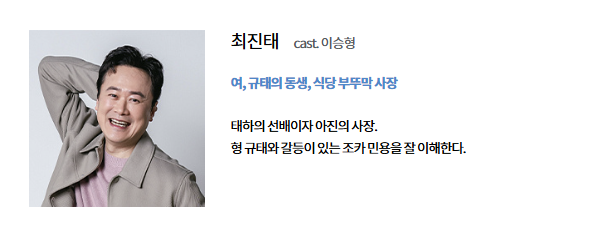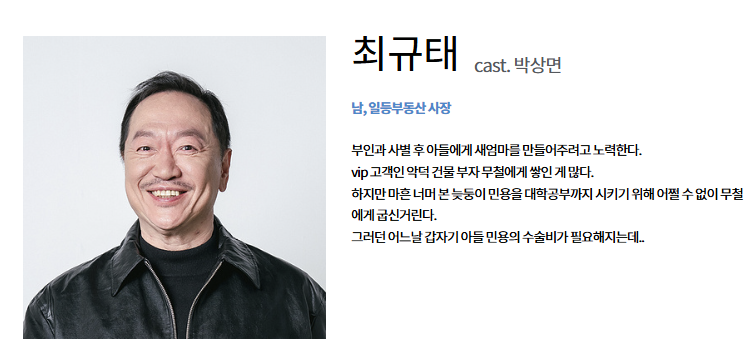 - 소개: 최규태는 대운 빌딩 주변에서 일등부동산을 운영하는 인물로, 부인과 사별 후 외동아들 민용을 위해 새엄마를 만들어주려 노력합니다. VIP 고객인 한무철에게 쌓인 불만이 많지만, 아들 민용의 대학 교육과 갑작스럽게 필요한 수술비를 위해 한무철에게 굽신거리는 현실적인 모습을 보입니다.