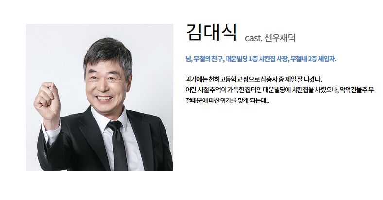 - 소개: 김대식은 한무철의 40년 지기 친구로, 대운 빌딩 1층에서 치킨집을 운영하며 2층에 세입자로 거주합니다. 과거 천하고등학교 삼총사 중 리더로 잘 나갔지만, 현재는 경제적 어려움 속에서 생계를 꾸려갑니다. 어린 시절 추억이 깃든 대운 빌딩에서 가게를 열었으나, 한무철의 악덕 행태로 파산 위기를 맞습니다.