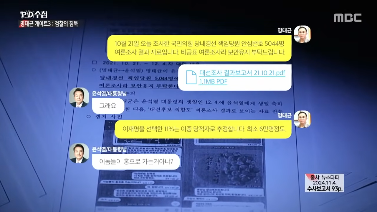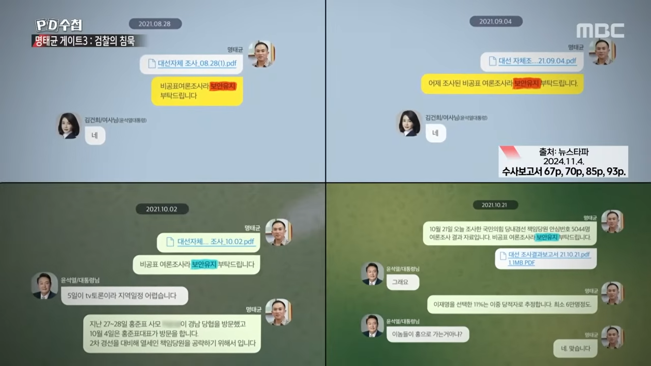 - 2021년 10월 21일 텔레그램 대화: 명태균은 미래한국연구소에서 진행한 여론조사 결과보고서를 윤석열에게 직접 전달했으며, 윤석열은 이를 분석하며 적극적으로 활용했습니다. 이 여론조사 비용(400만 원)은 윤석열의 공식 정치자금에서 지급되지 않았습니다.