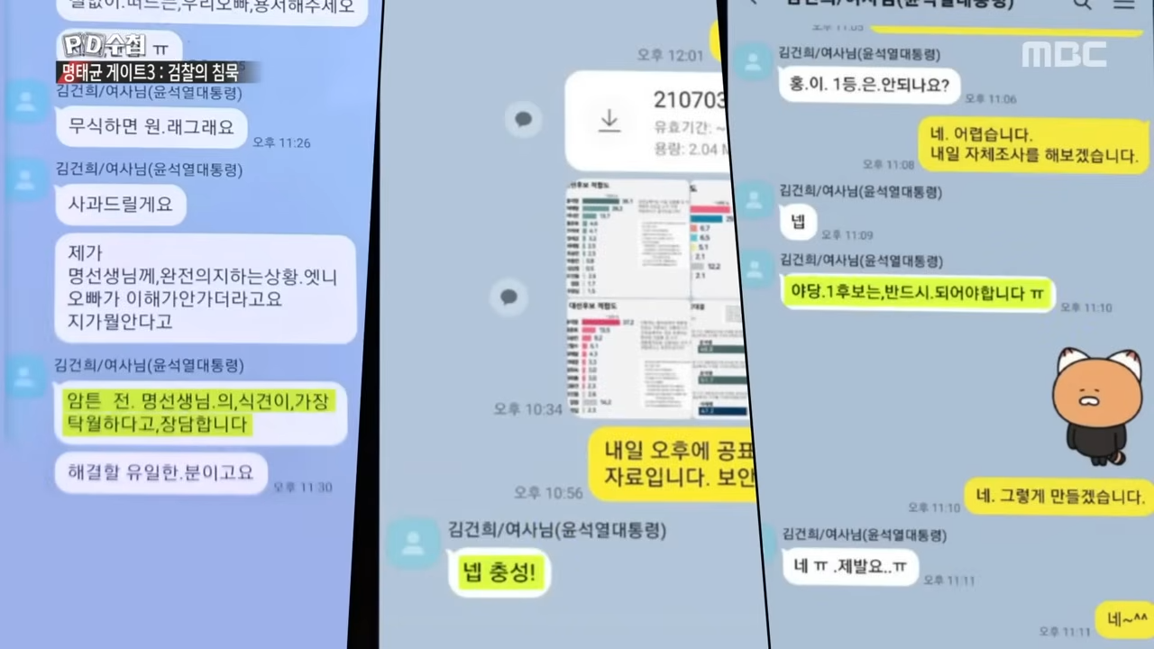 - 2021년 10월 5일 카카오톡 대화: 김건희 여사는 명태균에게 윤석열 후보가 홍준표 후보에게 밀릴까 걱정하며 여론조사를 요청했습니다. 명태균은 “자체조사”를 제안하며 이를 진행하겠다고 답했고, 김건희는 “넵”이라고 동의했습니다. 이 “자체조사”는 비공개 여론조사를 의미하며, 윤석열 후보에게 유리한 결과를 도출하기 위한 목적으로 이루어졌습니다.