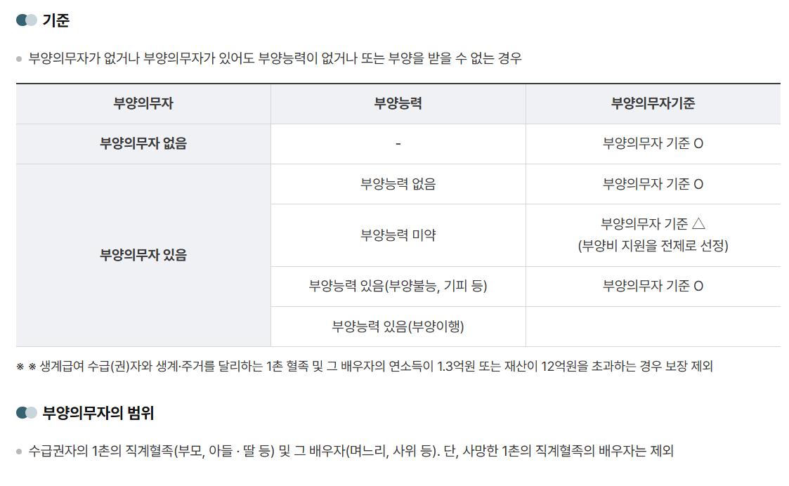 - 생계급여 제외 조건: 생계/주거를 달리하는 1촌 혈족(또는 배우자)의 연소득 1.3억 원 초과 또는 재산 12억 원 초과 시 제외