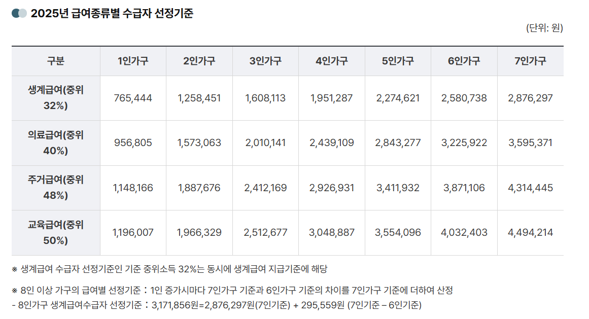 - 참고: 생계급여 선정 기준(중위소득 32%)은 지급 기준과 동일